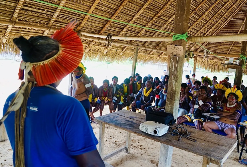 Representantes da Associação Terra Indígena Xingu (ATIX) e outras lideranças fizeram duas apresentações sobre mudanças climáticas e governança na Aldeia COP, durante a COP 30, que ocorre no Pará.