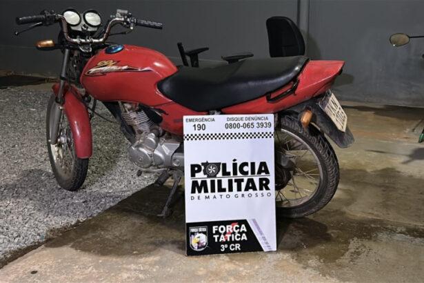 Após mais de um ano com registro de furto, uma motocicleta de cor vermelha foi recuperada pela Força Tática. O condutor foi abordado e conduzido até a delegacia de Polícia Civil, suspeito de receptação.