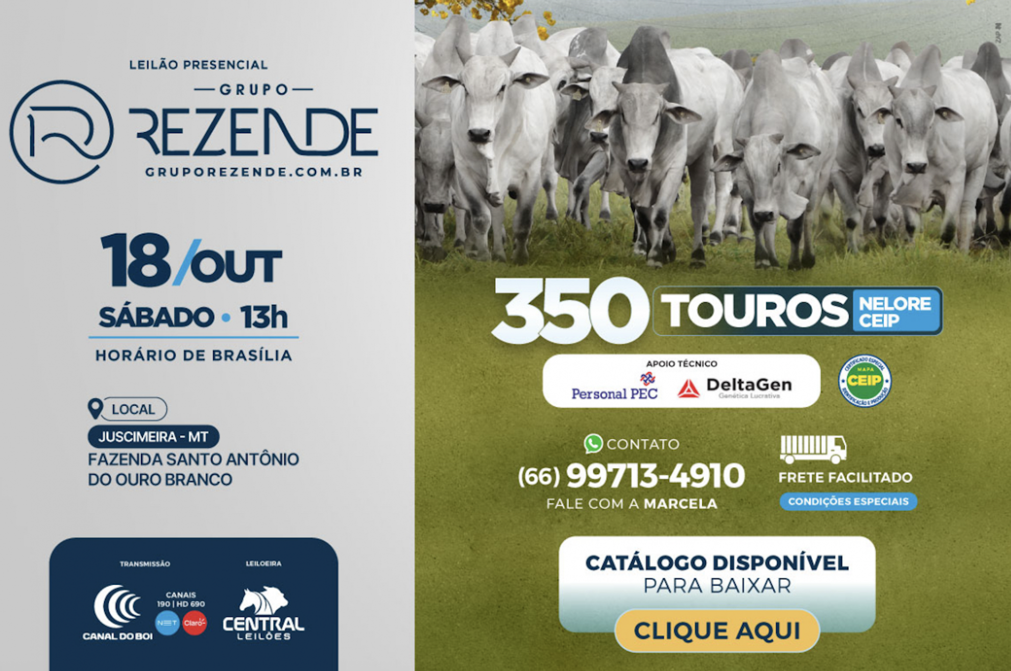 Com quase 70 anos de tradição, o Grupo Rezende, referência na pecuária nacional, realiza na próxima semana um grande leilão com 350 Touros Nelore CEIP. Confira os detalhes sobre o evento: